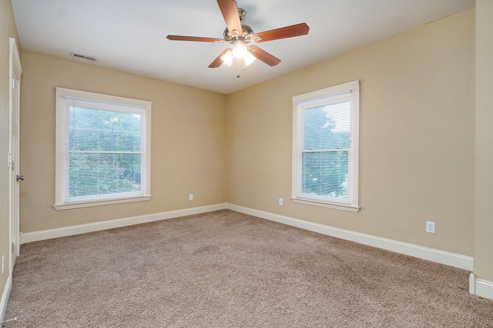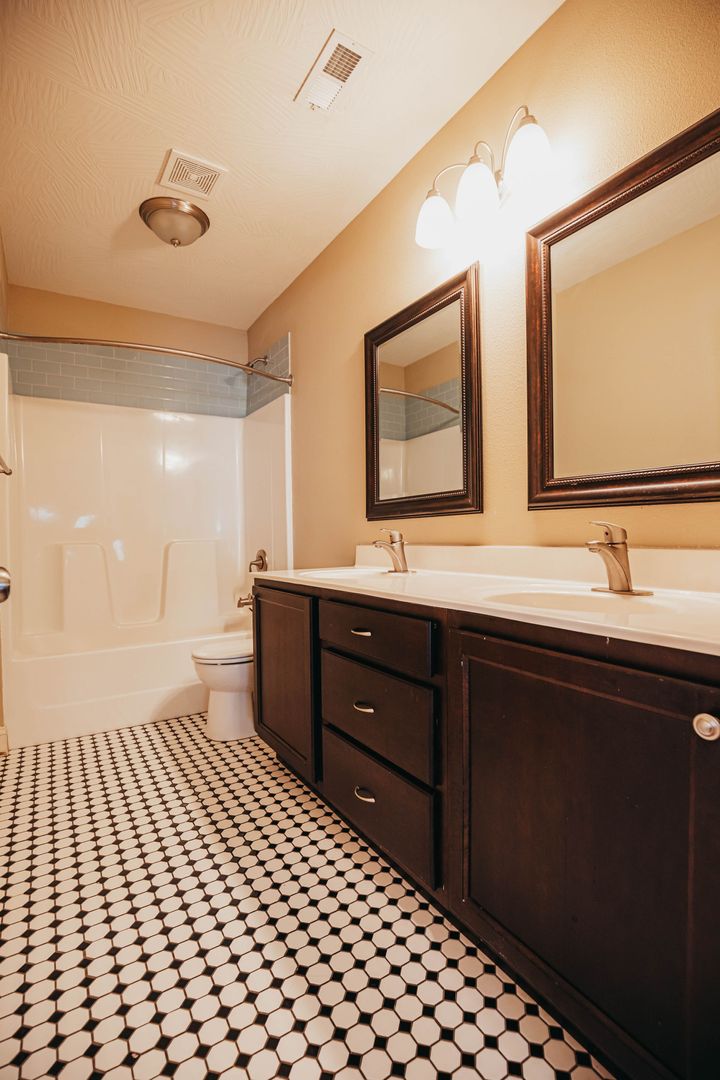 The living and dining area has hardwood floors that are easy to keep clean, and the bedrooms are carpeted so they’re super cozy. Both bathrooms are updated, and the main one has a double sink—perfect for sharing without fighting over the mirror.